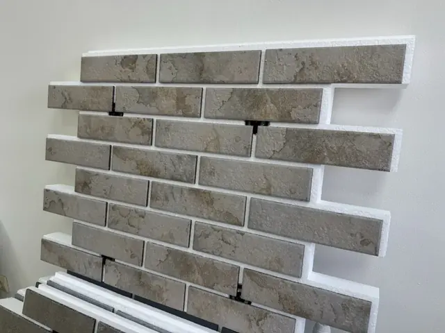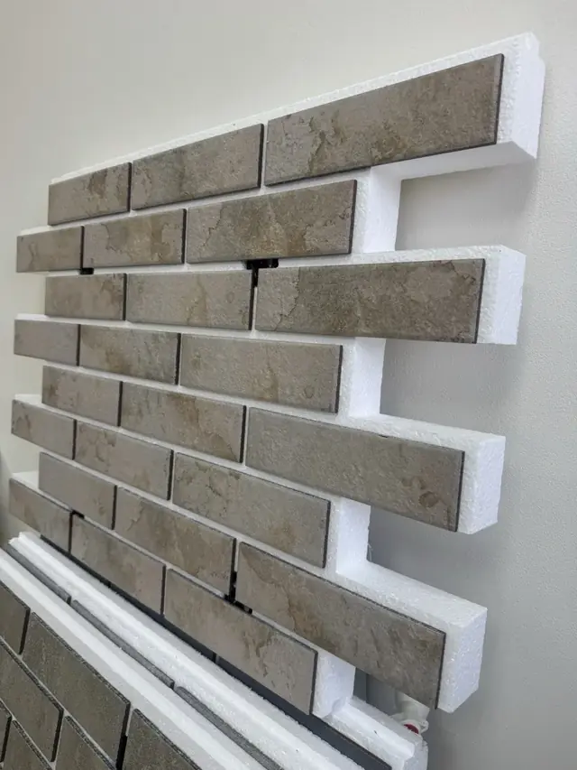 Клинкерная фасадная термопанель Айдахо 3. Цвет: Бежево-серый с мраморными разводами. Утепление пенополистиролом и облицовка польской клинкерной плиткой. Срок службы от 50 лет.